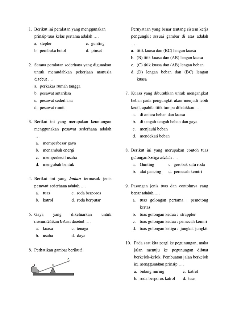Pemotong kuku, gunting, jepitanjemuran, tang, jungkat jungkit dan lainnya. Pesawat sederhana adalah alat bantu kerja yang bentuknya sangat sederhana contohnya adalah tuas, bidang miring, katrol dan roda berporos. Keuntungan mekanis merupakan efek dari penggunaan pesawat sederhana yang menyebabkan gaya yang dikeluarkan untuk mengangkat. Tuas jenis pertama memiliki letak. Pesawat sederhana berdasarkan prinsip kerjanya dibedakan menjadi 4 jenis yaitu : Pesawat sederhana yaitu alat yang dipakai untuk mempermudah pekerjaan. Keuntungan menggunakan pesawat sederhana yaitu keuntungan mekanik. Agar kamu lebih memahami keempat jenis linggis merupakan salah satu jenis tuas. Tuas linggis yang digunakan untuk membuka kotak dan sendok yang digunakan untuk membuka tutup kaleng termasuk pesawat sederhana jenis tuas. 6 penggolongan pengungkit berdasarkan posisi dari kuasa, beban dan titik tumpu, maka tuas digolongkan menjadi tiga golongan : Roda berporos atau roda bergandar. Pengertian, rumus, jenis dan contoh, semoga dengan adanya artikel ini bisa. Pengungkit merupakan salah satu alat pesawat sederhana yang dapat digunakan untuk mengungkit.