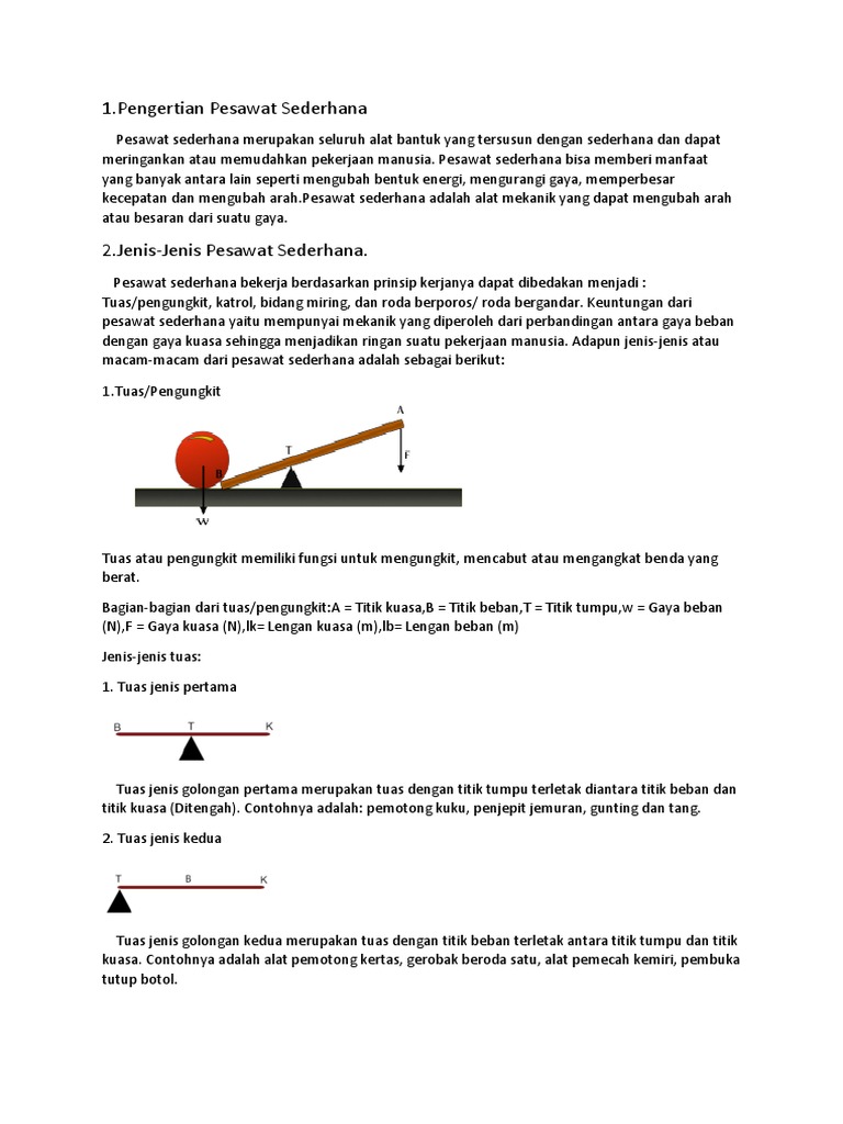 Pesawat sederhana terdiri atas beberapa jenis. Tuas memudahkan usaha dengan cara menggandakan gaya kuasa dan mengubah arah gaya. Pesawat sederhana ada 4 jenis, yaitu tuas (pengungkit), katrol, bidang miring, dan roda berporos. Ada tiga titik penting dalam tuas yaitu titik beban (w), titik tumpu (t) dan titik kuasa (f). Britannica.comilustrasi pesawat sederhana dan jenisnya.